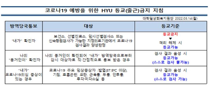 2. 코로나19 예방을 위한 HYU 등교(출근)금지 지침_22.3.14(월)