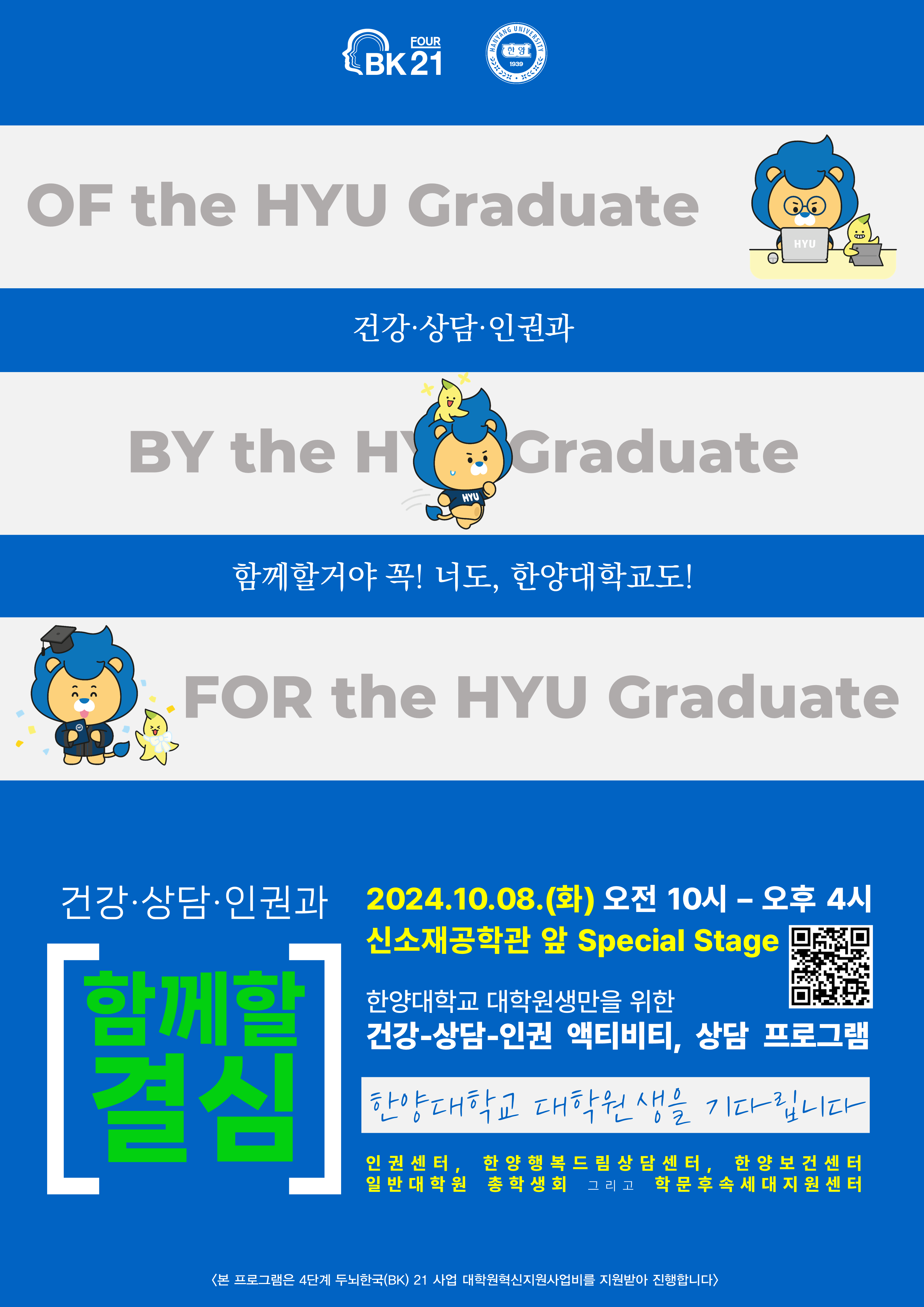 4단계 BK21 대학원 혁신지원사업의 일환으로 '건강, 상담, 인권과 함께할 결심: 2024 HY-BK21 일반대학원생 행복찾기 페스티벌'을 다음과 같이 안내하오니 참고하시면 됩니다.