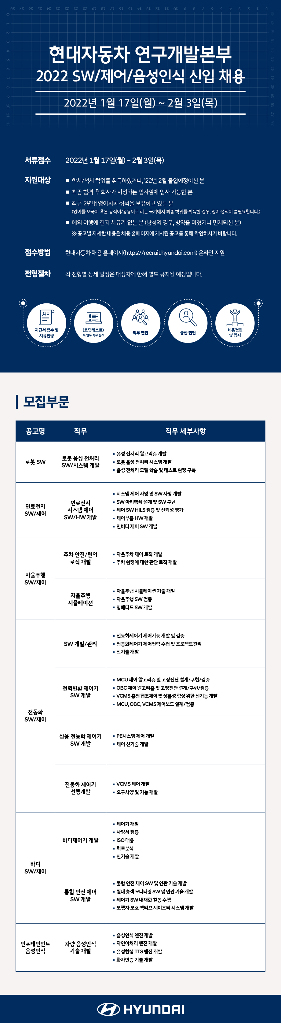 [현대자동차] 현대자동차 연구개발본부 2022 SW/제어/음성인식 신입 채용(01/17(월)~02/03(목))