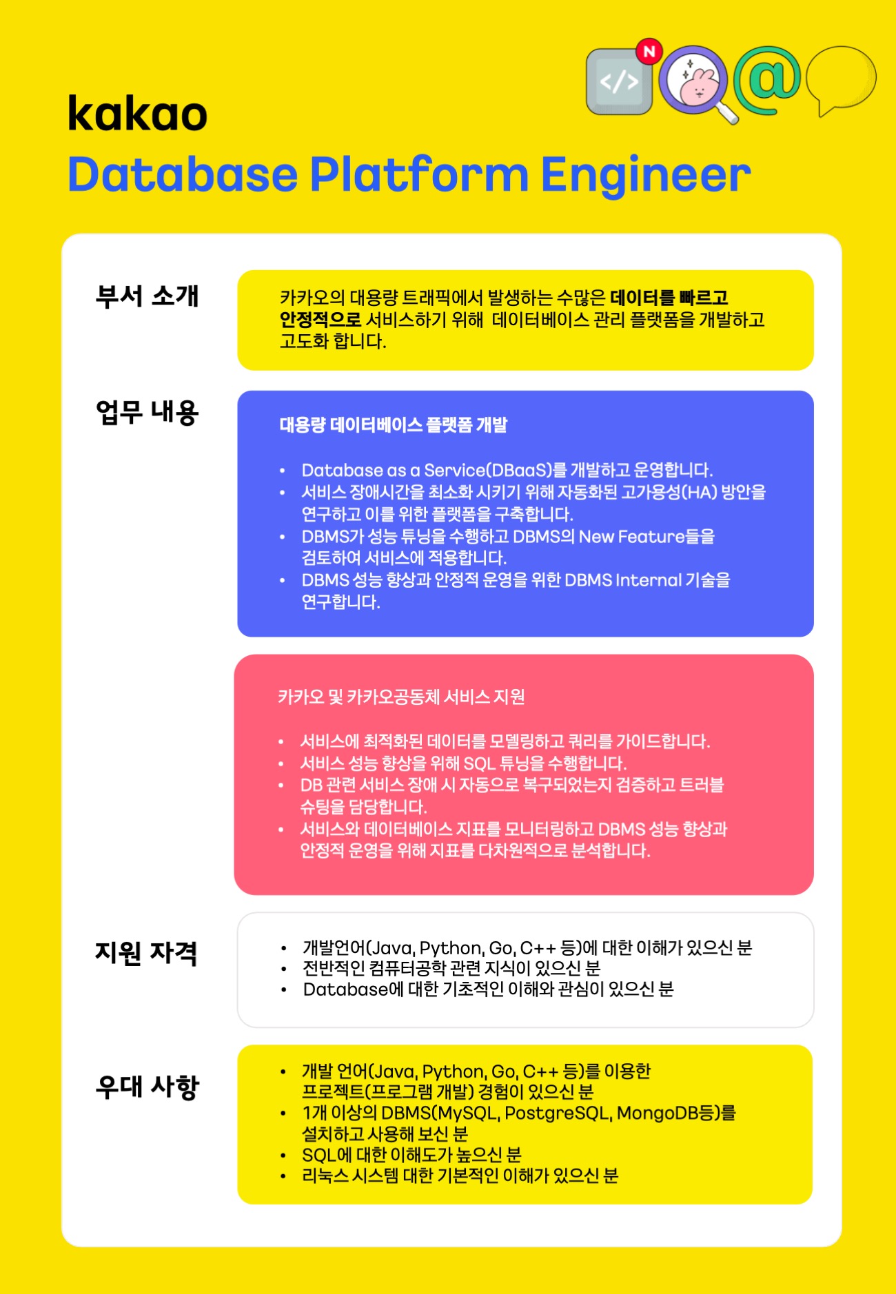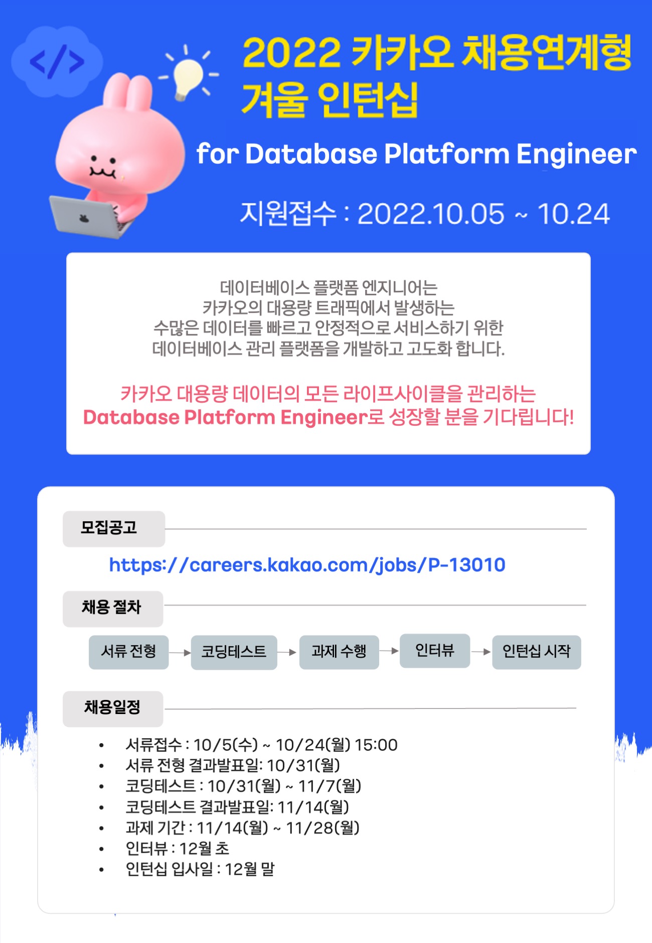 [채용] 2022 카카오 채용연계형 겨울인턴쉽 for Database Platform Engineer 모집 안내