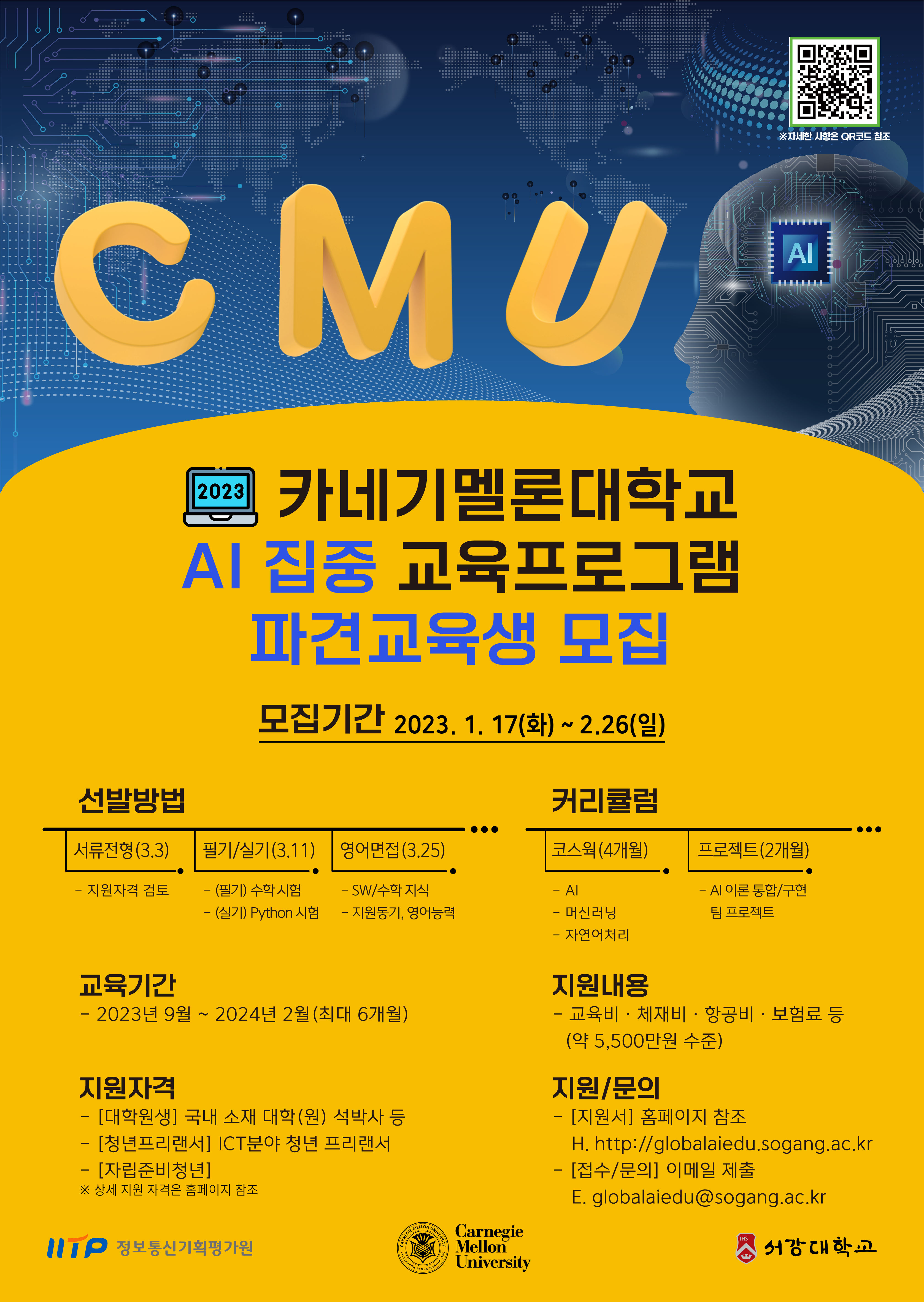 가. 지원개요 : AI 분야 세계 1위인 미국 카네기멜론대(Carnegie Mellon University, 이하 CMU)에 교육 프로그램을 개설, 국내 우수 석·박사 학생 등 대상 AI 집중 현지 교육 실시