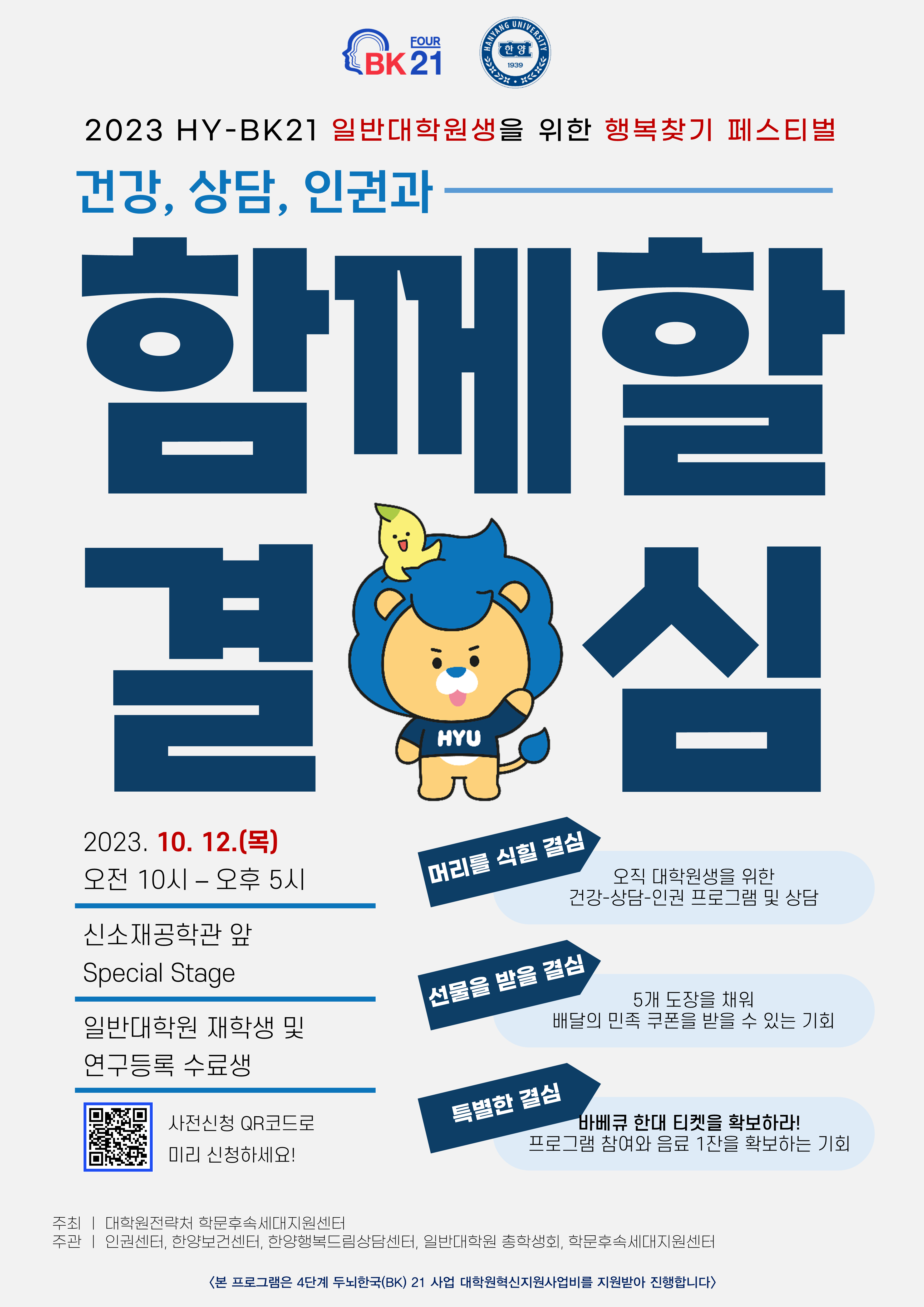 4단계 BK21 대학원 혁신지원사업의 일환으로 '건강, 상담, 인권과 함께할 결심: 2023 HY-BK21 일반대학원생 행복찾기 페스티벌'을 다음과 같이 안내합니다.