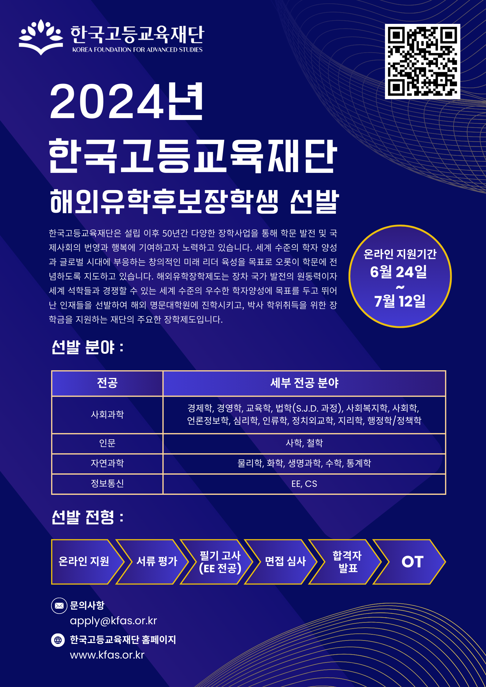 6월 24일(월) ~ 7월 12일(금) 까지 2024 해외유학후보장학생을 모집하오니 많은 신청과 관심을 부탁드립니다.
