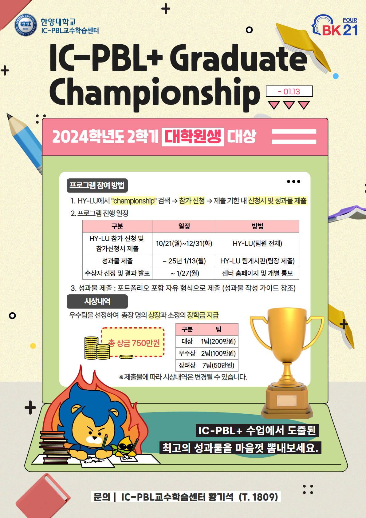 한양대학교 4단계 BK21 대학원 혁신지원사업의 일환으로 대학원생 대상 IC-PBL+ Graduate Championship을 개최하오니 관심과 참여 부탁 드립니다.