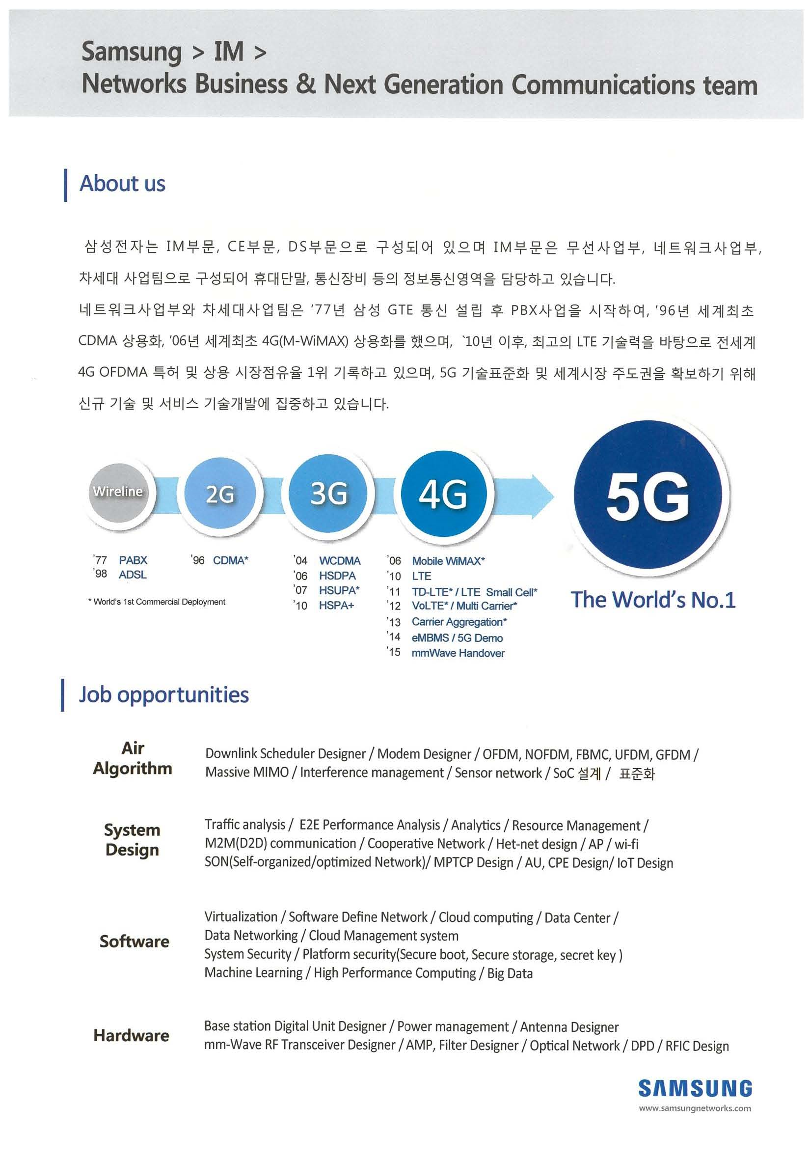 삼성전자 네트워크사업부와 차세대사업팀에서 통신관련 분야의 박사채용을 진행하고 있습니다.