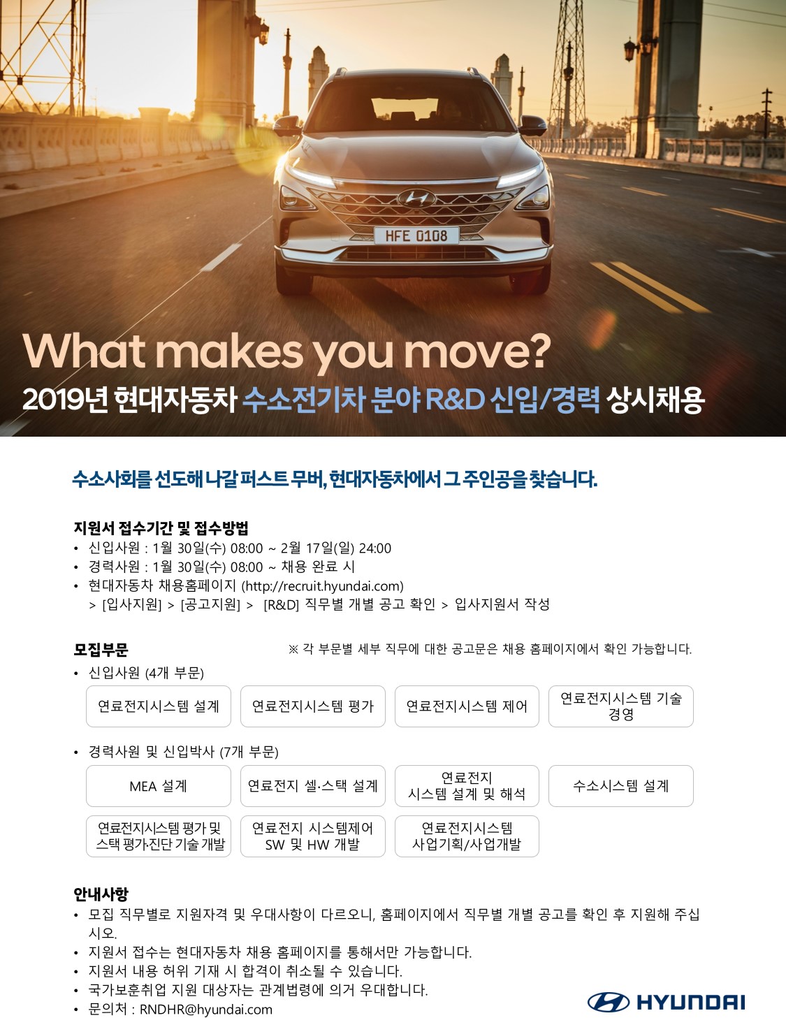 현대자동차에서 수소전기차분야 R&D 신입/경력 상시채용을 아래와 같이 진행하오니 관심있는 학생은 참고하여 주시기 바랍니다.