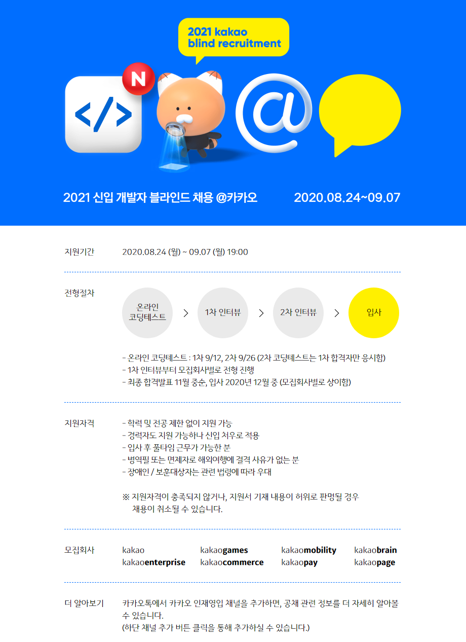 [채용] 카카오 2021 신입 개발자 블라인드 채용