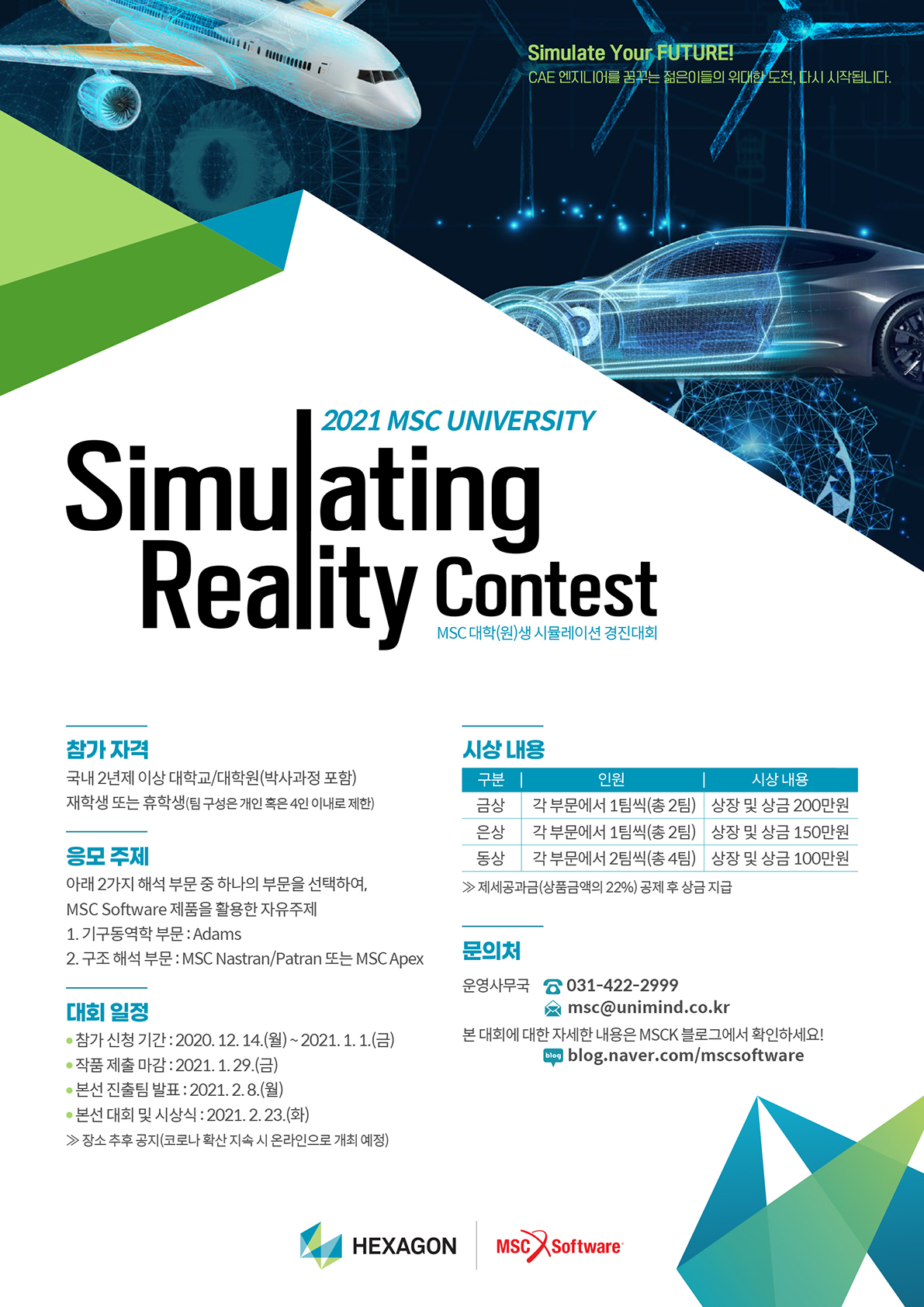 MSC Software는 여러분이 그 동안 쌓아 온 실력과 역량을 마음껏 펼칠 수 있도록 제9회 ‘Simulating Reality Contest’를 개최합니다.