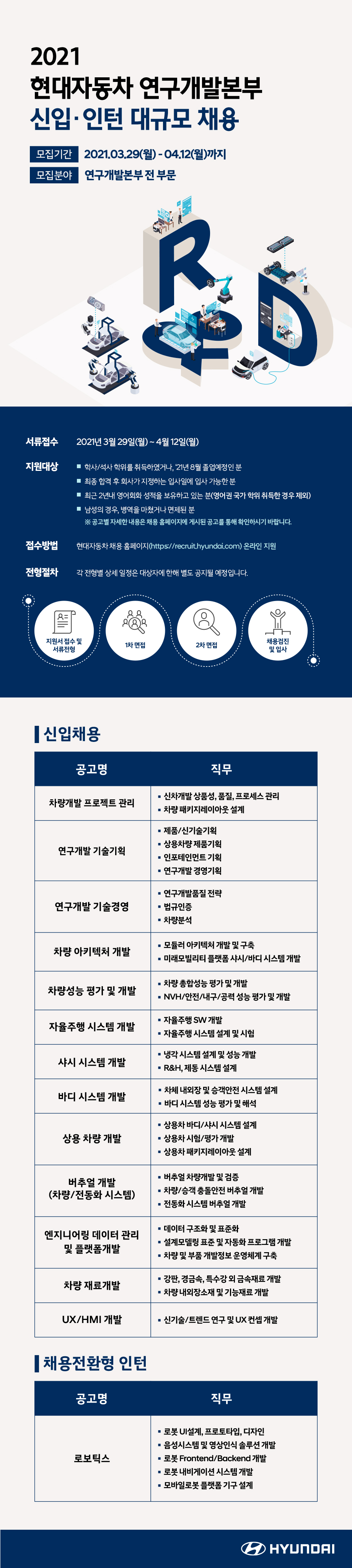 [채용] [현대자동차] 2021 현대자동차 연구개발본부 신입 · 인턴 대규모 채용(~4.12)