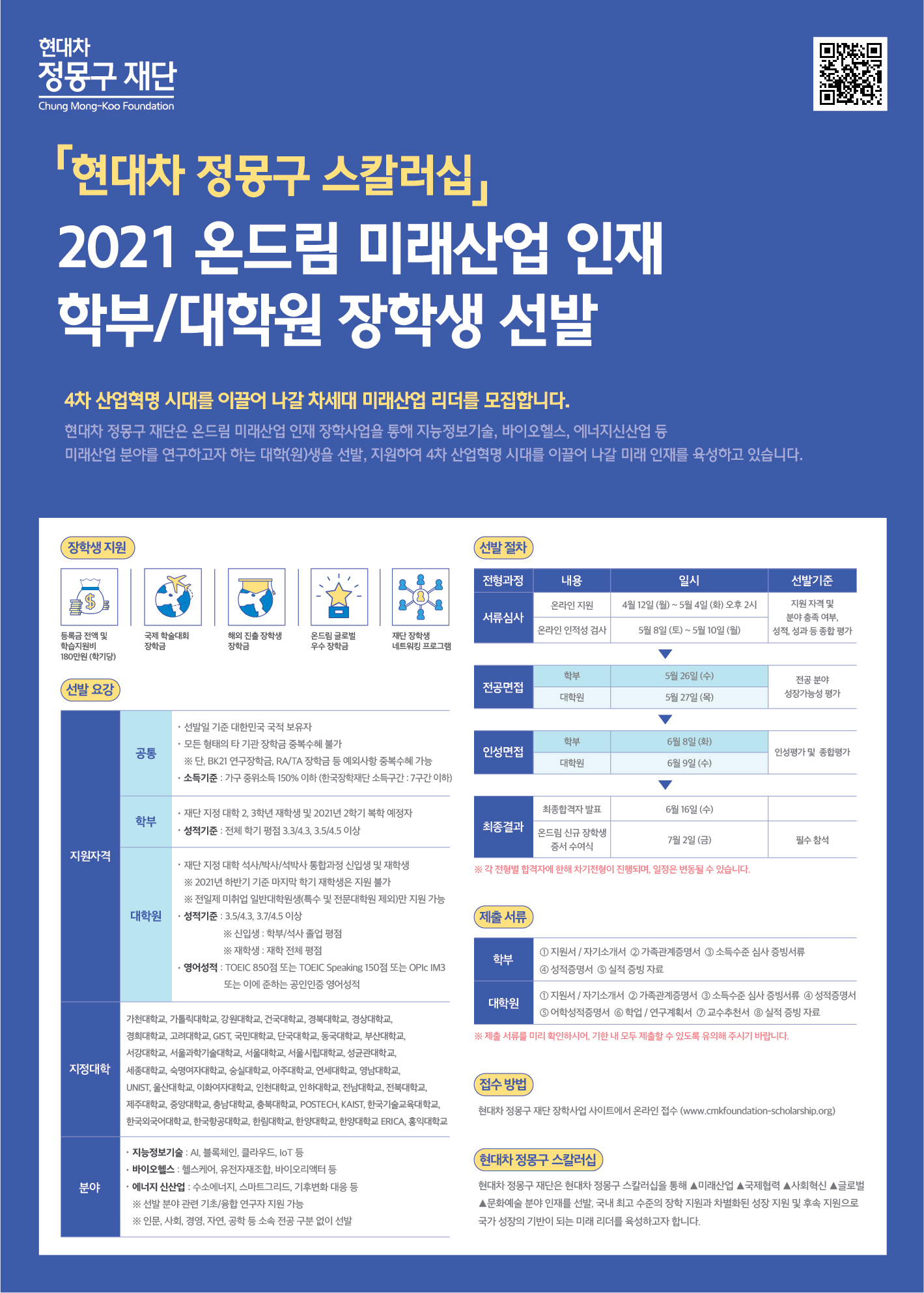 [현대차 정몽구 스칼러십] 2021 온드림 미래산업 인재 장학생 선발(포스터)