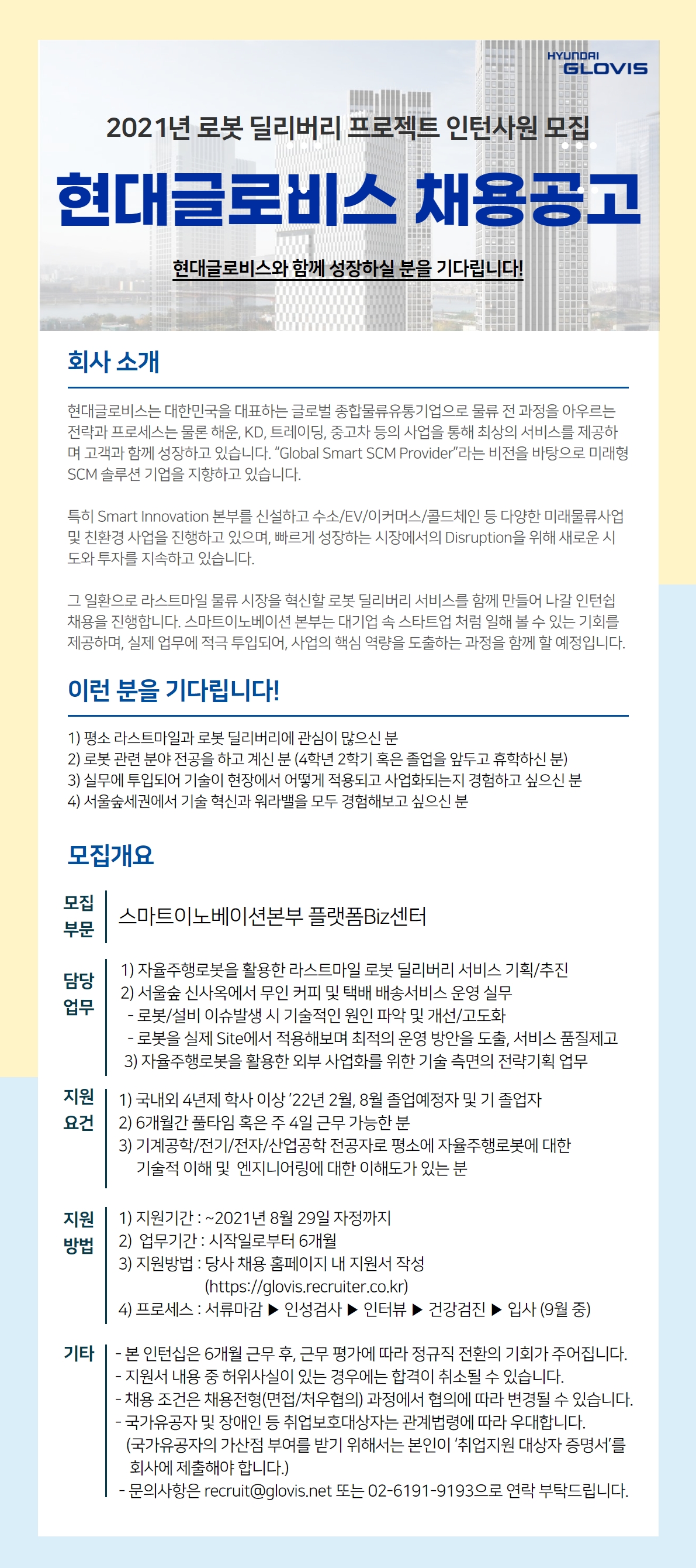 [현대글로비스] 2021년 로봇 딜리버리 프로젝트 인턴사원 모집 (~08.29)