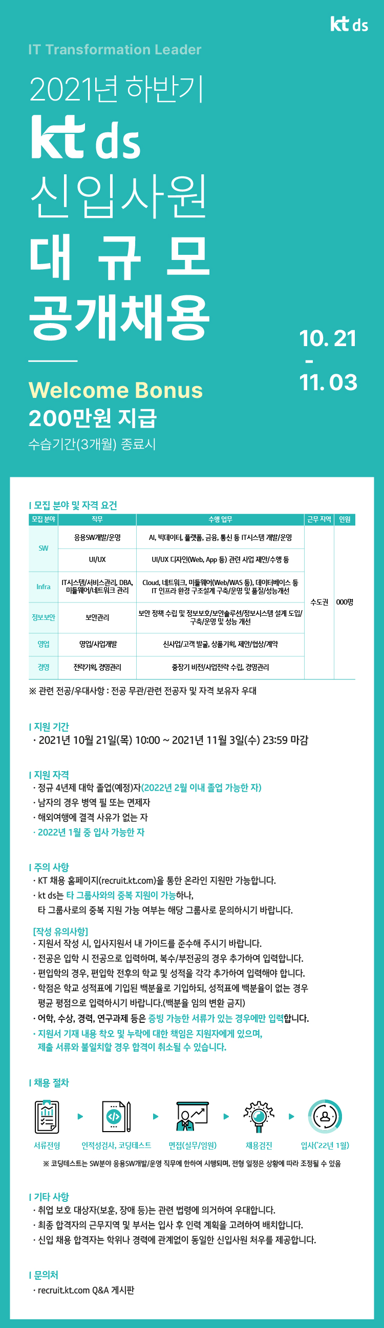 [채용] [kt ds]2021 하반기 kt ds 신입사원 대규모 공개채용 (~11.03(수))
