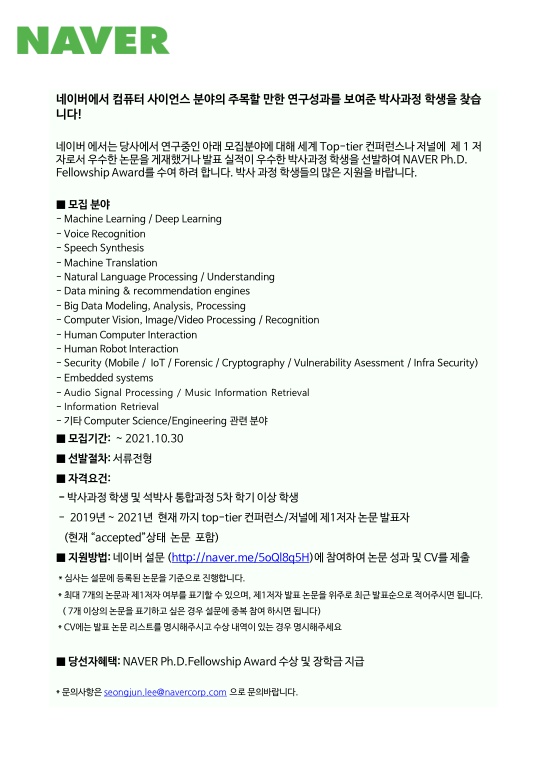 [채용] 2021 NAVER PhD Fellowship선발