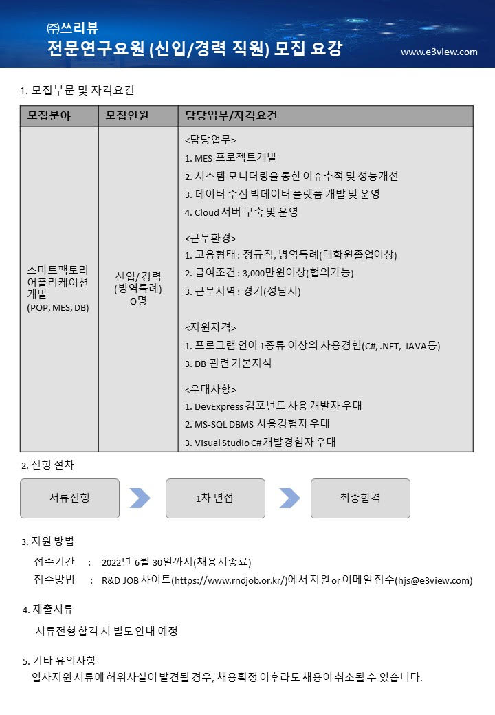 6. 지원방법: R&D, JOB 사이트(https://www.rndjob.or.kr/) 또는 이메일접수(hjs@e3view.com)/이력서, 자기소개서, 포트폴리오 자유양식