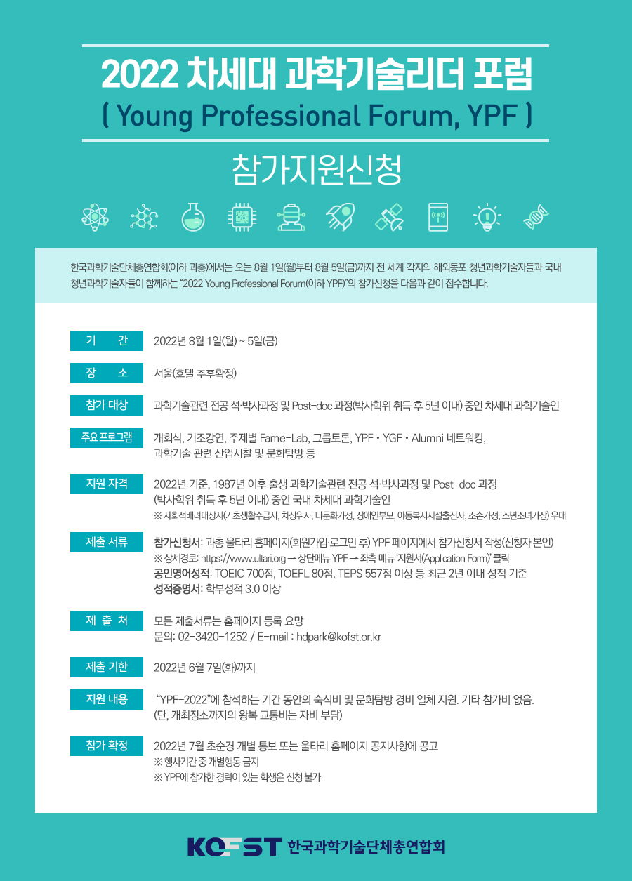 한국과학기술단체총연합회에서는 해외동포 차세대 과학기술인과 국내 차세대 과학기술인 간 네트워크를 통해 글로벌 리더로 성장하기 위한 플랫폼 구축을 위하여 “2022 차세대 과학기술리더포럼(Young Professional Forum, 이하 “YPF-2022”)을 개최합니다.