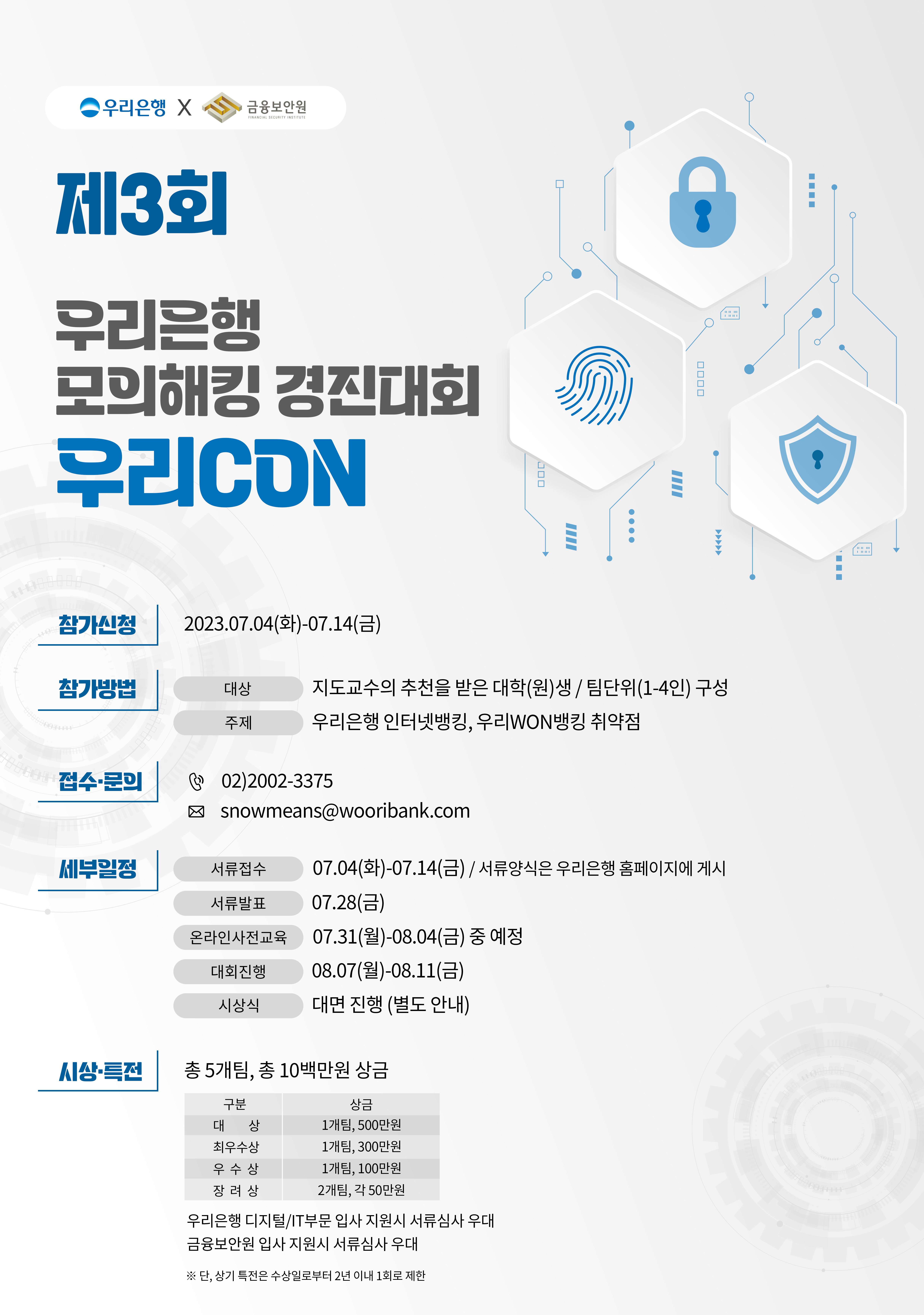○ 대회명 : 우리은행 + 금융보안원 모의해킹 경진대회 WooriCON