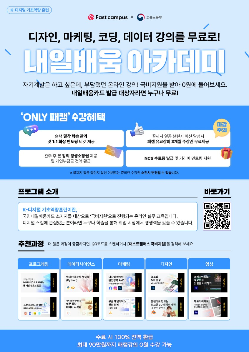 - 수료시 자부담금 100% 환급 및 평생소장권 제공