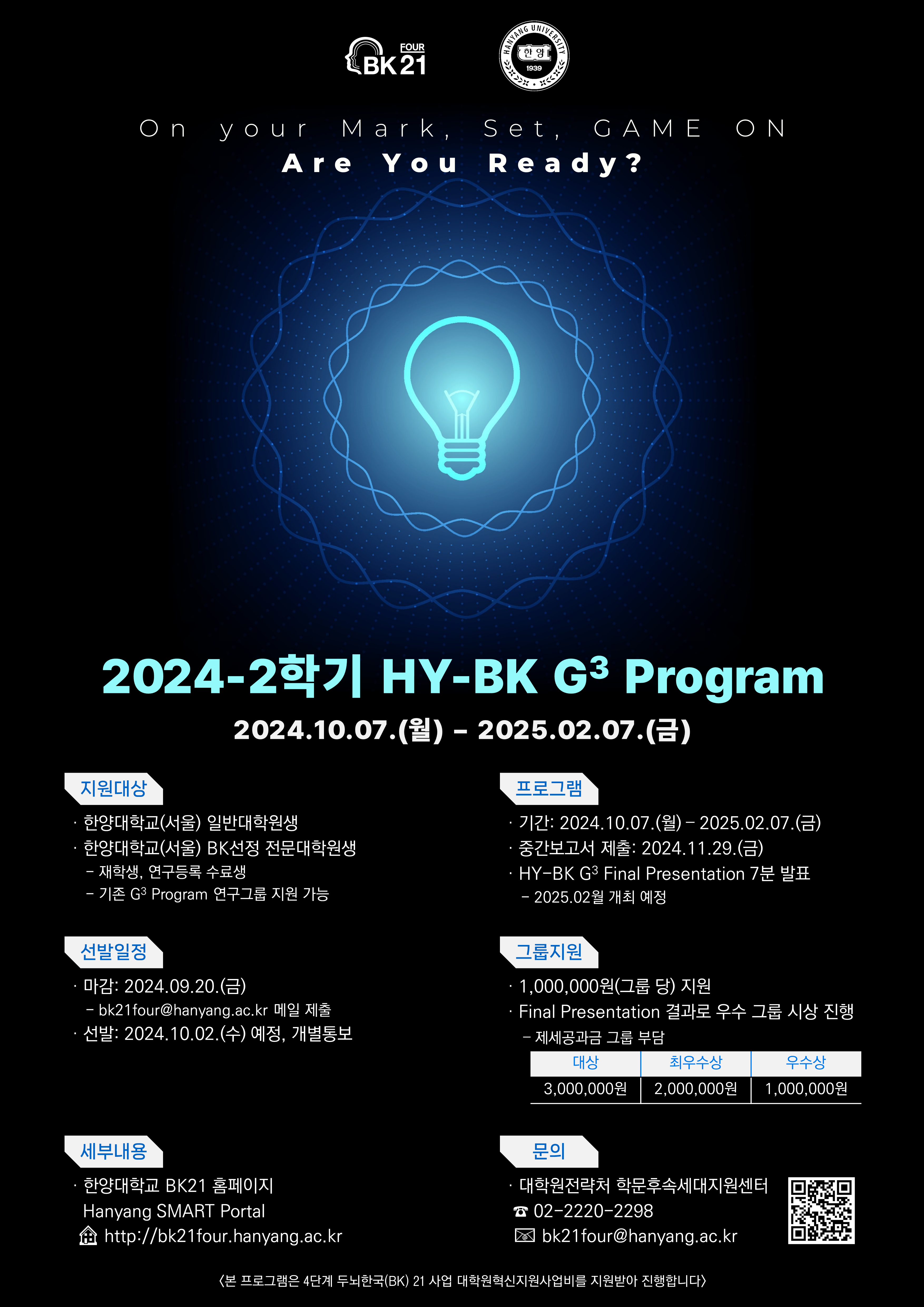 [홍보] 2024-2학기 대학원생 융합연구 프로그램(HY-BK G3 Program) 안내