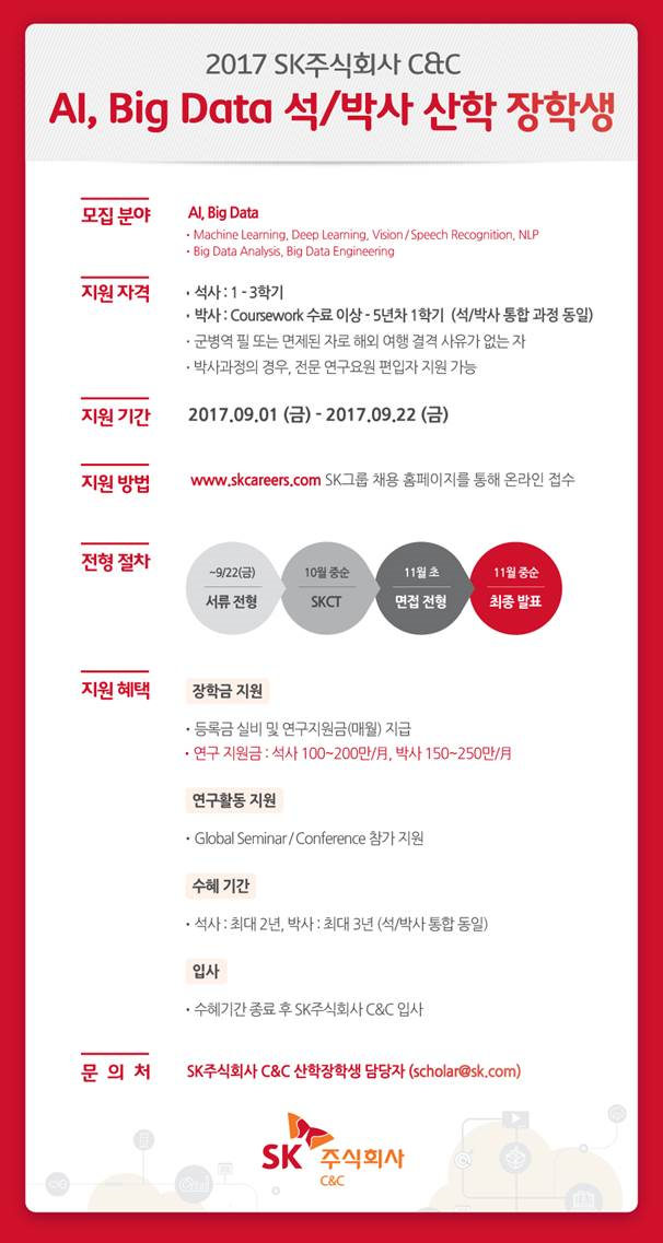 4. 지원 방법 : www.skcareers.com 접속 → “채용 공고” 클릭 → “[SK주식회사 (C&C)] 2017년 AI 산학장학생 선발” 공고 선택 → 지원하기