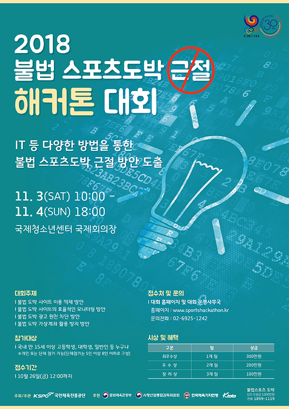 국민체육진흥공단에서 아래와 같이 2018 불법 스포츠 도박 근절 해커톤대회를 진행하오니 관심있는 학생들의 많은 참여 바랍니다.