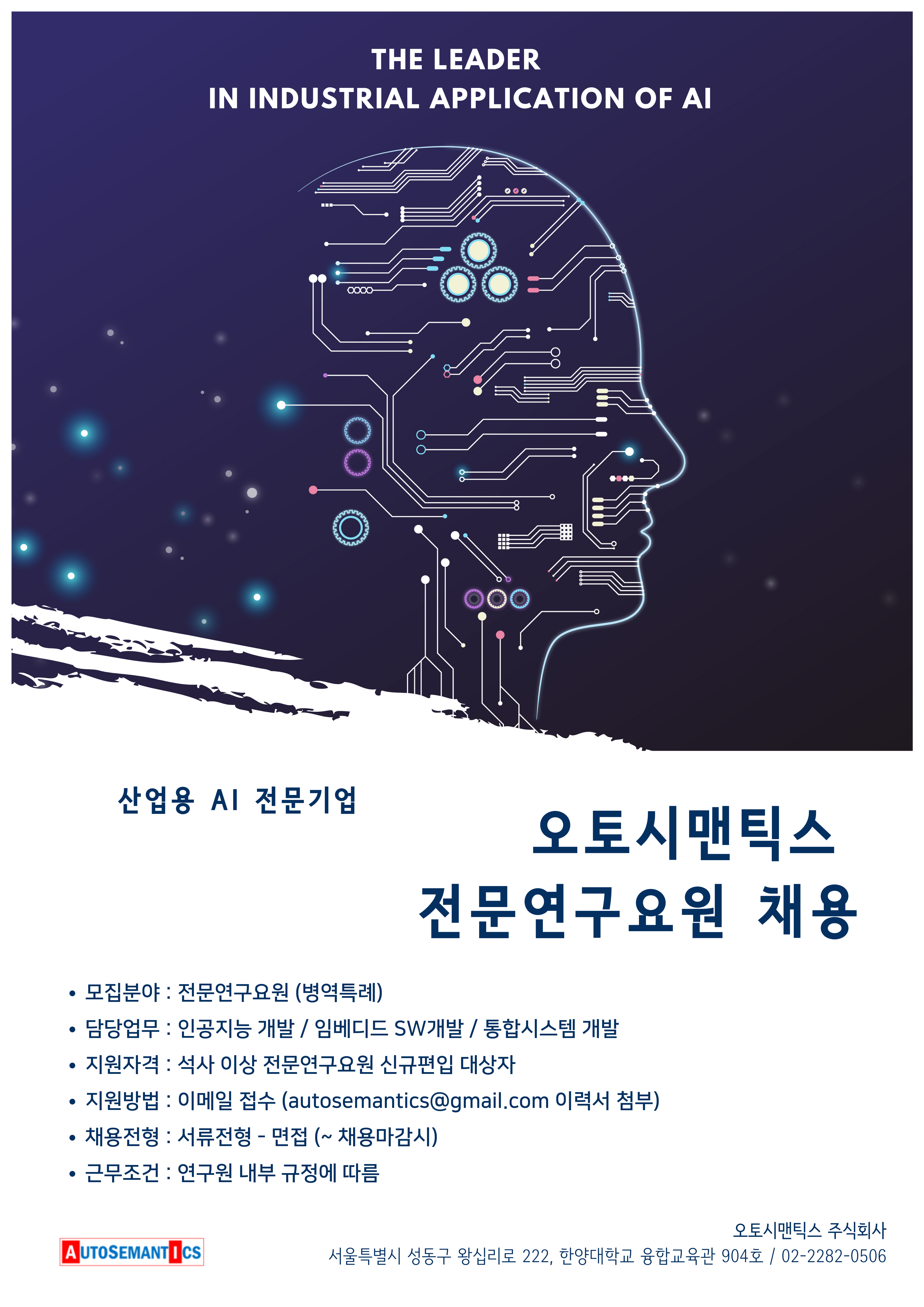 오토시맨틱스에서 인턴연구원 및 전문연구요원 채용을 아래와 같이 진행하오니 관심있는 학생들의 많은 지원 바랍니다.