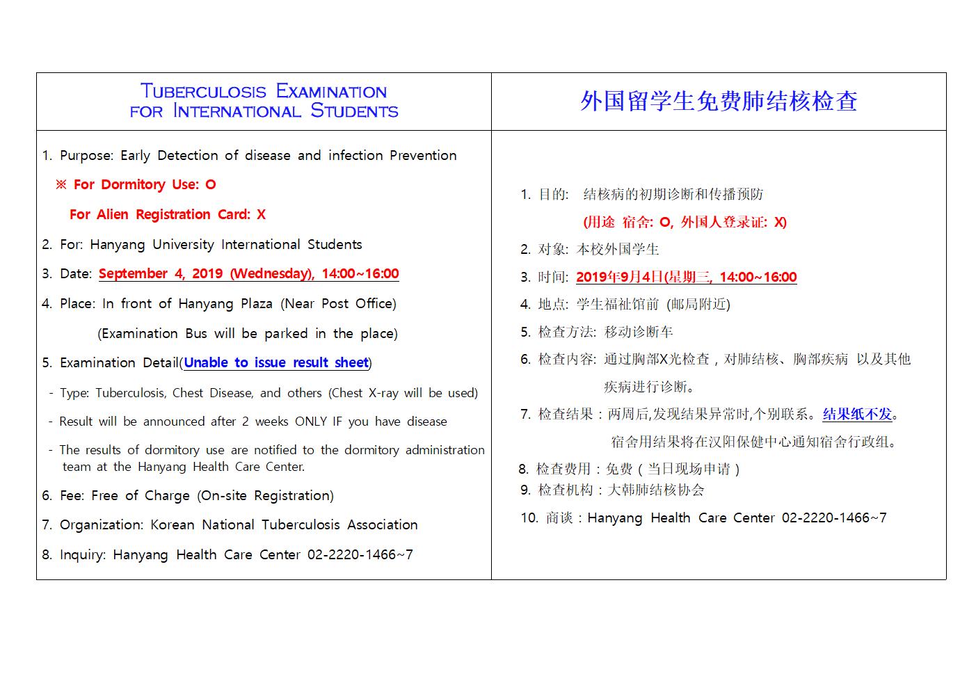 2019 2학기 외국인 유학생 무료 결핵검진 안내문