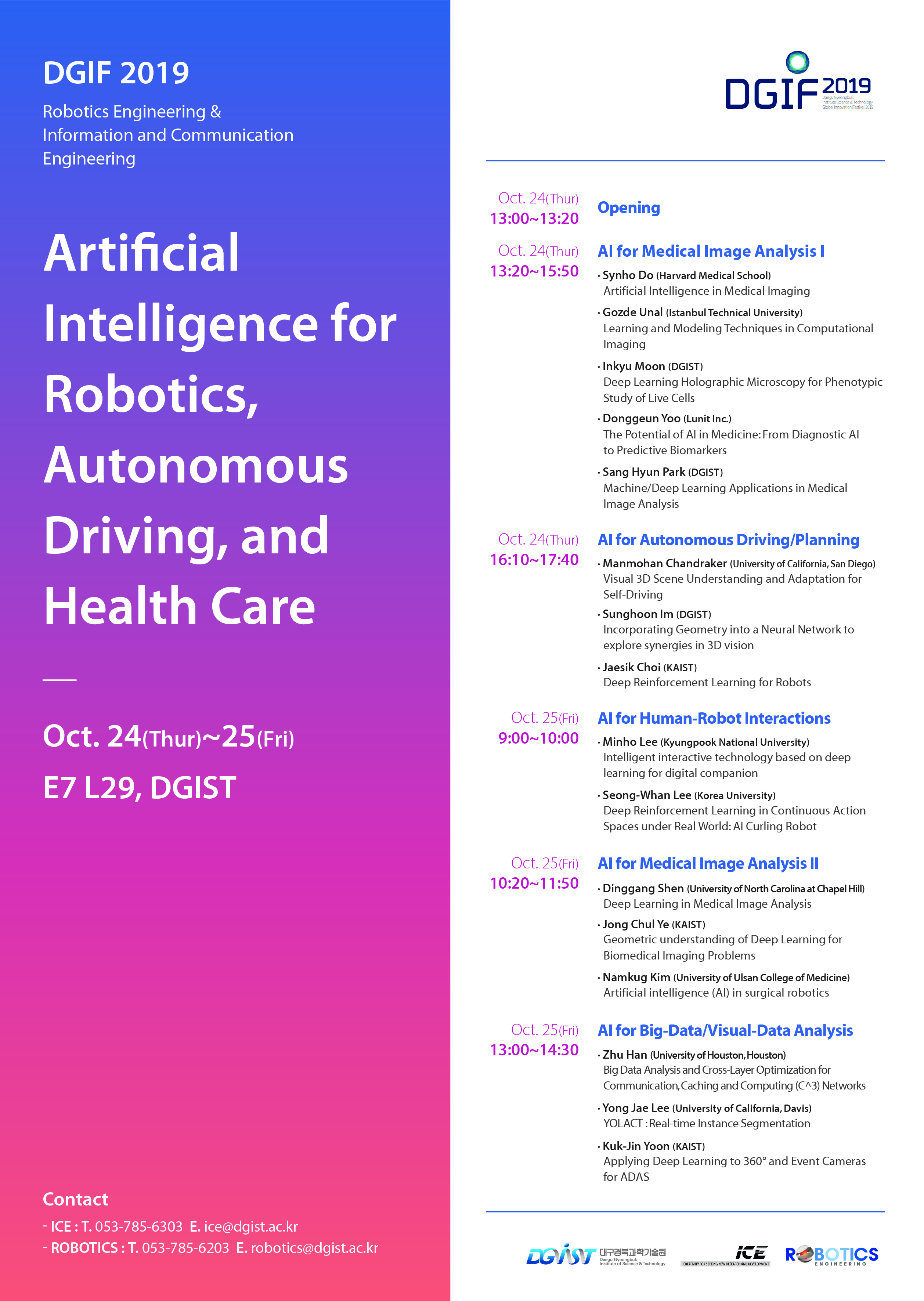 대구경북과학기술원에서 Artificial Intelligence for Robotics, Autonomous Driving, and Health Care」를 주제로 인공지능 관련 국내외 저명한 연구자들을 초청하여 강연 및 관련 분야 연구교류의 장을 마련하고자 DGIST Global Innovation Festival 2019를 아래와 같이 개최하오니 관심있는 학생들의 많은 참여 바랍니다.