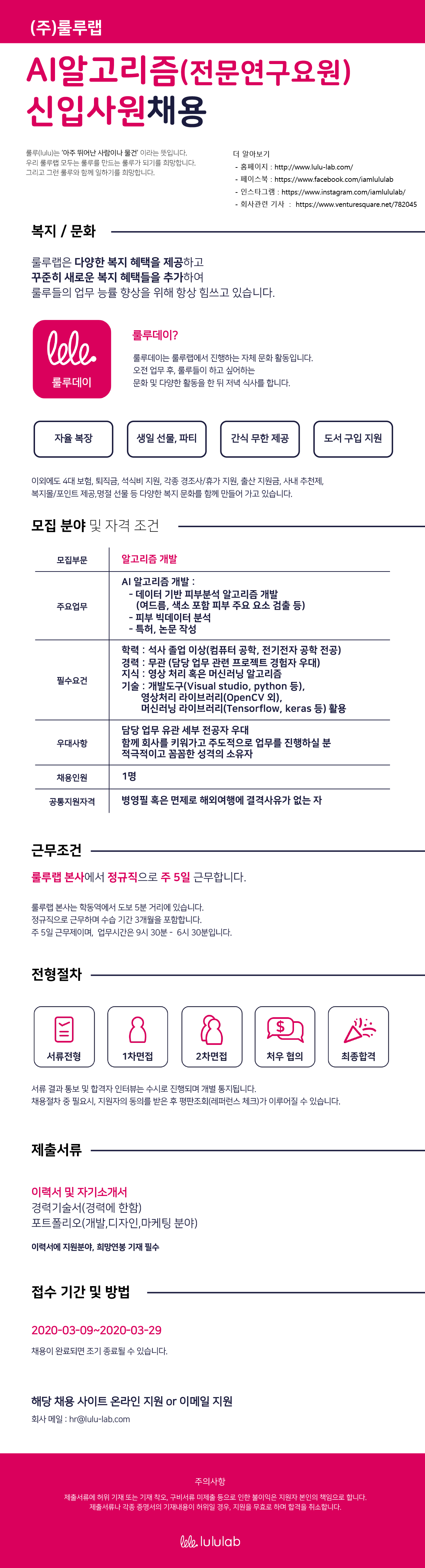 추가로 궁금한 부분이나 필요한 내용은 070-4256-2678, hr@lulu-lab.com 으로 문의주시기 바랍니다.