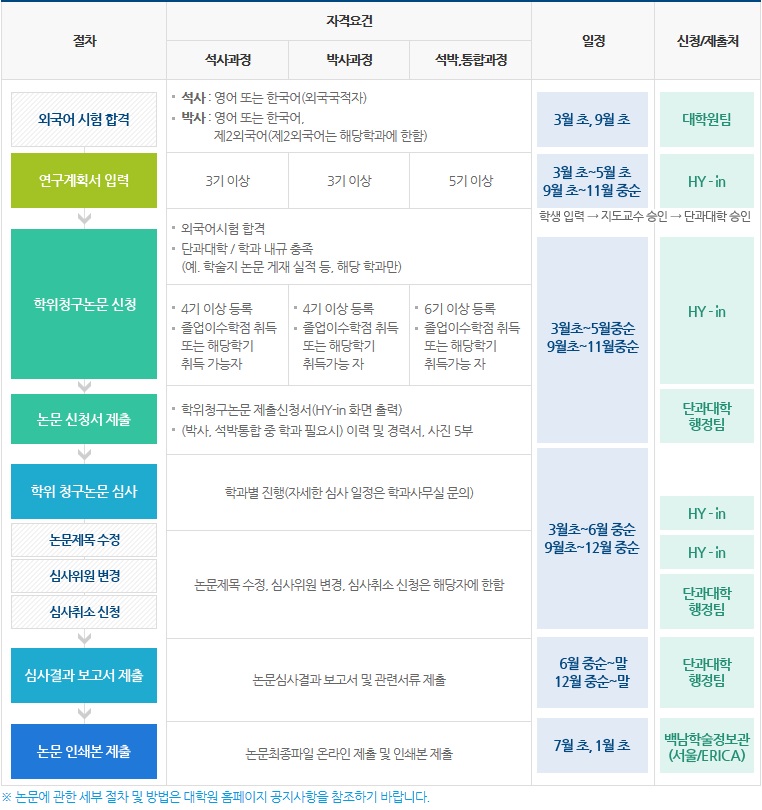 ② 논문게재증빙서류/논문게재예정증명서 | ① 학위청구논문 제출신청서 1부 ② 전문학술지급 논문지 200%이상 게재 and ③ 공청회 개최 예정일 고지 (일주일 전 메일 부탁드립니다. 학과담당자 김혜령: foxsas@hanyang.ac.kr) |